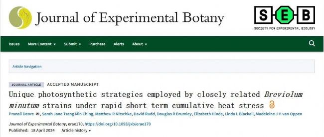 2024年4月18日,Journal of Experimental Botany雜志在在線發(fā)表墨爾本大學(xué)生物科學(xué)學(xué)院為署名單位,標(biāo)題為Unique photosynthetic strategies employed by closely related Breviolum minutum strains under rapid short-term cumulative heat stress的研究論文。