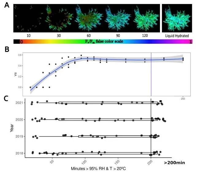 2024年6月14日,Science Advances雜志在線發(fā)表美國(guó)明尼蘇達(dá)大學(xué)Daniel E. Stanton實(shí)驗(yàn)室題為Symbionts out of sync: Decoupled physiological responses are widespread and ecologically important in lichen associations的研究論文。在本研究中,Abigail R. Meyer等人研究了地衣(Evernia mesomorpha)中這種不對(duì)稱的生理、生態(tài)和轉(zhuǎn)錄基礎(chǔ)。這種碳平衡的不對(duì)稱性取決于水合來(lái)源,并與氣候范圍的限制相一致。地衣共生體的基因表達(dá)差異表明,主要地衣共生體的生理結(jié)構(gòu)是分離的。此外,研究人員還利用氣體交換數(shù)據(jù)表明,碳平衡的不對(duì)稱性在進(jìn)化過(guò)程中不同的地衣共生體中普遍存在。以碳平衡不對(duì)稱為例,他們?yōu)楣采w中生理不對(duì)稱的廣泛重要性提供了證據(jù)。本研究中葉綠素?zé)晒獾臏y(cè)量通過(guò)葉綠素?zé)晒獬上裣到y(tǒng)IMAGING-PAM完成。