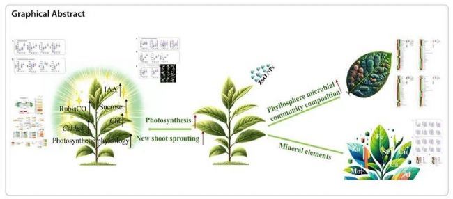 納米技術在農(nóng)業(yè)領域具有革命性的潛力,氧化鋅納米顆粒(ZnO NPs)在促進作物生長方面顯示出優(yōu)勢。光合作用效率的提高與茶樹活力和品質(zhì)的提高密切相關,與葉際微生物維持植株健康也有關。然而,ZnO NPs對茶樹光合作用、新梢萌發(fā)和葉際微生物群落的影響還沒有得到充分的研究。7月2日,Journal of Nanobiotechnology在線發(fā)表了青島農(nóng)業(yè)大學園藝學院范凱老師課題組題為Zno nanoparticles: improving photosynthesis, shoot development, and phyllosphere microbiome composition in tea plants的研究論文。文章揭示了ZnO NPs對茶樹光合作用和新梢發(fā)育的積極影響,并且對茶樹葉際附生微生物群落和葉際內(nèi)生微生物群落起到了一定的改善作用。