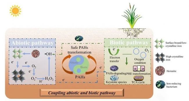 富鐵基質(zhì)人工濕地(constructed wetlands, CWs)由于成本低等優(yōu)點被廣泛應用于再生水回用領域,它可通過生物和非生物途徑實現(xiàn)微量有機污染物的高效去除。不幸的是,對于富鐵基質(zhì)CW中促進羥基自由基(•OH)形成和確保多環(huán)芳烴(PAHs)安全轉化的必需活性鐵種類,特別是在長期運行的CWs中,仍然存在研究空白。此外,富鐵基質(zhì)CW實現(xiàn)PAHs安全轉化的生物和非生物途徑之間的耦合關聯(lián)和機制仍然是一個研究空白。7月2日,Water Research在線發(fā)表山東大學環(huán)境科學與工程學院胡振教授課題組題為Biotic/Abiotic Transformation Mechanisms of Phenanthrene in Iron-rich Constructed Wetland under Redox Fluctuation的研究論文。文章對富鐵基質(zhì)CW在不同氧化還原條件下對菲(Phenanthrene)轉化過程進行了探索。利用Mössbauer光譜分析技術闡明了參與•OH生成的關鍵活性鐵物種,利用宏基因組學技術闡明了菲在富鐵CW中的生物轉化機制。最后,通過冗余分析(RDA)和偏最小二乘路徑建模(PLS-PM)揭示了生物/非生物轉化機制對菲轉化的貢獻及其關聯(lián)關系。