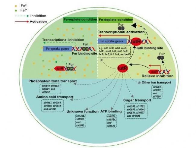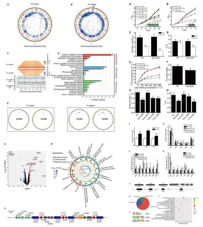 研究團隊利用Hi-C分析集胞藻在鐵充足和缺鐵條件下的三維基因組結構,發(fā)現(xiàn)基因互作頻率發(fā)生顯著變化。缺鐵條件下,集胞藻基因組上0.1M區(qū)域的互作強度明顯增加;CID邊界發(fā)生調(diào)整,影響眾多參與細胞代謝、細胞通訊、離子結合及受體活性等功能的基因。為了深入分析三維染色體結構與基因表達在不同鐵水平下的關聯(lián),該研究進一步結合缺鐵條件下的轉錄組分析發(fā)現(xiàn),上述互作頻率顯著增強的0.1M區(qū)域是藍藻缺鐵響應基因分布密集區(qū),包括IutR在內(nèi)的眾多基因分布于該區(qū)域,并且均在缺鐵時顯著上調(diào)表達,預示著這些基因很可能參與藍藻的缺鐵適應過程。研究團隊通過對三個同源iutR基因的單敲除和組合三敲除,發(fā)現(xiàn)組合三敲除的藻株對缺鐵條件極為敏感,多個生理表型在缺鐵條件下與野生型表現(xiàn)出顯著差異,但在鐵充足時與野生型沒有差別,將IutR重新回補到突變株中可以恢復至野生型的生理表型,表明IutR的缺失突變是藍藻缺鐵敏感的主要原因。與此同時,qRT-PCR結果表明,突變株中鐵吸收相關基因喪失了受缺鐵誘導上調(diào)表達的能力,說明突變株的缺鐵信號轉導過程受到嚴重影響。隨后,該研究利用轉錄因子和DNA互作實驗(EMSA和酵母單雜交)證明,IutR蛋白能夠結合并調(diào)控包括TonB依賴性鐵轉運系統(tǒng)在內(nèi)的多個鐵吸收相關基因啟動子序列。通過ChIP-seq實驗,研究不僅鑒定了IutR結合的DNA序列特征,還預測了全基因組中IutR可能調(diào)控的靶基因,包括Fe3+吸收轉運蛋白FutABC、Fec家族、isiB、ftr1及FurA等。此外,RT-qPCR和EMSA實驗進一步確認了所預測的啟動子序列可以被IutR蛋白結合,并且這些基因的轉錄水平受到IutR的顯著調(diào)控。