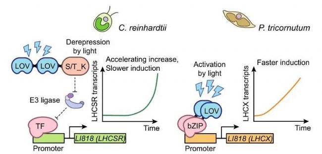 進一步研究表明,AUREO1c蛋白利用LOV結構域探測光照壓力,并通過其bZIP DNA結合域直接激活靶基因(包括編碼NPQ效應蛋白的LI818基因)的表達。與在淡水綠藻——萊茵衣藻(Chlamydomonas reinhardtii)中報告的激酶介導的途徑相比,AUREO1c途徑展現(xiàn)出了更快的響應速度,并能夠在連續(xù)高光照和波動光照處理下,使LI818的轉錄本和蛋白水平累積到相當?shù)某潭取?/span>
