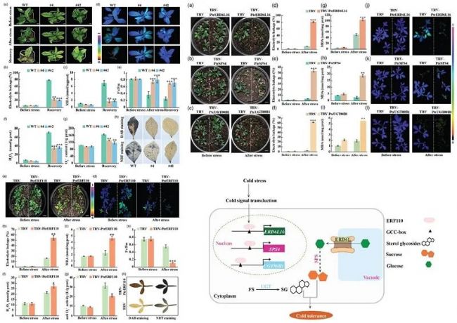 枳(Poncirus trifoliata (L.) Raf.)是柑橘上最常用的砧木,抗寒性較強,是研究低溫應答的重要柑橘資源。本研究中,研究人員從枳中鑒定出一種受寒冷誘導的ERF,命名為PtrERF110。PtrERF110是一種具有轉錄激活活性的核蛋白。研究發(fā)現(xiàn),PtrERF110的過表達顯著增強了檸檬(Citrus limon)和煙草(Nicotiana tabacum)的耐寒性,而病毒誘導的基因沉默(virus induced gene silencing,VIGS)介導的PtrERF110敲低則大大削弱了耐寒性。RNA序列分析表明,PtrERF110過表達導致一系列應激反應基因的整體轉錄重編程。其中三個基因,包括PtrERD6L16(early responsive dehydration 6-like transporters)、PtrSPS4(sucrose phosphate synthase 4)和PtrUGT80B1(UDP-glucose: sterol glycosyltransferases 80B1),被證實為 PtrERF110 的直接靶標。此外,與野生型植物相比,PtrERF110過表達植物始終表現(xiàn)出更高的糖和甾醇水平,而 VIGS植物則呈現(xiàn)相反趨勢。外源蔗糖供應恢復了PtrERF110沉默植物的抗寒性。此外,PtrSPS4、PtrERD6L16和PtrUGT80B1的敲低顯著削弱了枳的抗寒性。