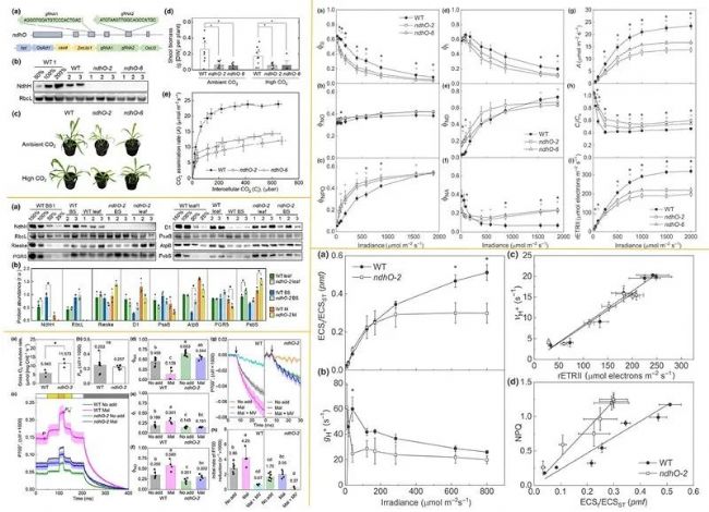 研究團隊首先使用CRISPR/Cas9基因編輯技術在狗尾草(Setaria viridis)中創(chuàng)建了ndhO的突變體。這些狗尾草突變體具有缺乏功能性NDH的ndhO等位基因,并開發(fā)了量化BS和葉肉細胞中通過NDH的電子流的方法。相關結果表明,CEF占BS細胞中PSI還原電子的84%,其中大部分電子通過NDH傳遞,而葉肉細胞中該復合體對電子傳遞的貢獻微乎其微。缺乏NDH的植物葉片CO2同化率和生長速度下降,無法通過提供額外的CO2來挽救。此外,NDH介導的CEF是BS葉綠體中主要的電子傳遞途徑,這凸顯了NDH在BS細胞中產(chǎn)生C3循環(huán)固定CO2所需的ATP方面的重要作用。