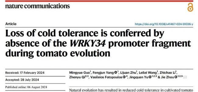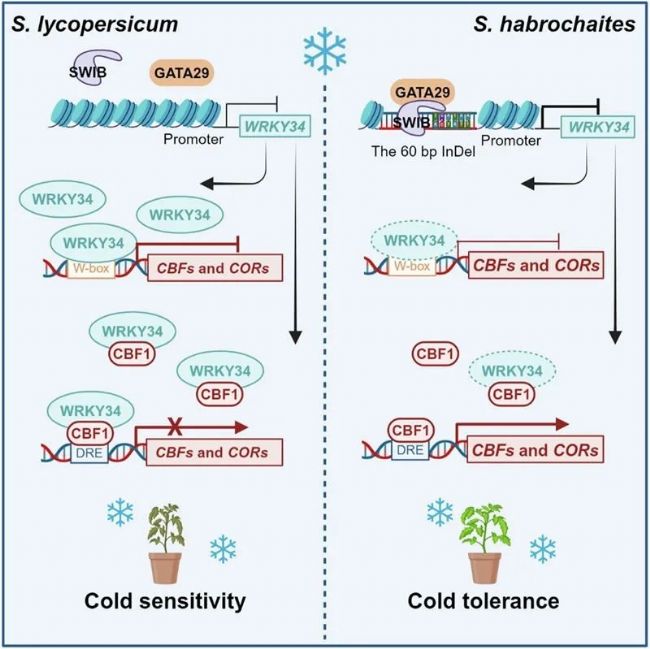 2024年8月6日,Nature Communications在線發(fā)表了浙江大學喻景權(quán)院士團隊周杰教授為通訊作者題為Loss of cold tolerance is conferred by absence of the WRKY34 promoter fragment during tomato evolution的研究論文。研究團隊對冷敏感的栽培番茄和耐寒的野生多毛番茄進行ATAC-Seq和RNA-Seq分析,發(fā)現(xiàn)WRKY34基因與冷脅迫下的染色質(zhì)可及性和表達模式密切相關(guān)。進一步研究發(fā)現(xiàn),WRKY34啟動子中的60bp InDel導致了不同番茄品種在轉(zhuǎn)錄和耐寒性上的差異,該片段中的GATA順式調(diào)控元件與SWIBs和GATA29結(jié)合,協(xié)同抑制WRKY34的表達。此外,WRKY34還通過調(diào)節(jié)轉(zhuǎn)錄和蛋白質(zhì)水平干擾CBF冷響應途徑。這些發(fā)現(xiàn)表明,順式調(diào)控區(qū)域的多態(tài)性對作物進化過程中染色質(zhì)結(jié)構(gòu)和基因表達具有重要影響,進而影響了番茄的耐寒性。