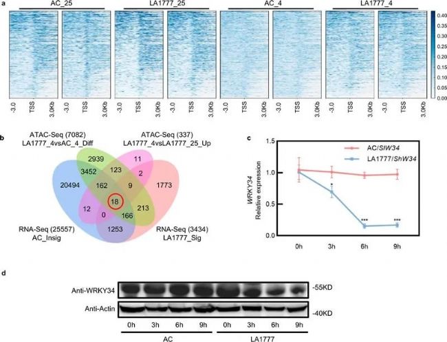 圖1 冷脅迫后栽培番茄和野生番茄中ATAC-Seq和RNA-Seq的聯(lián)合分析結(jié)果,以及WRKY34的表達模式和蛋白質(zhì)積累差異。