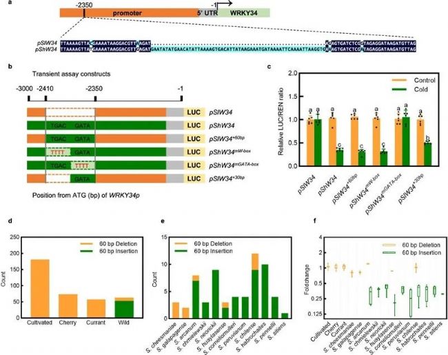 WRKY34啟動子區(qū)域的60bp InDel導致其在冷脅迫下的表達模式不同:通過比較不同番茄種質(zhì)中WRKY34的蛋白質(zhì)序列,發(fā)現(xiàn)其在冷脅迫下的表達模式差異而非蛋白質(zhì)功能差異決定了野生番茄和栽培番茄耐寒性的差異;對SlWRKY34和ShWRKY34的啟動子進行擴增和測序,發(fā)現(xiàn)野生番茄中存在60bp的插入,而栽培番茄中不存在,且該插入與WRKY34在冷脅迫下的表達抑制顯著相關(guān)。