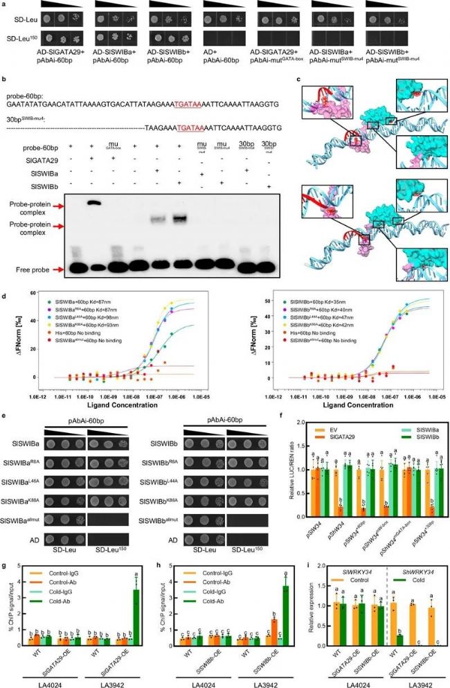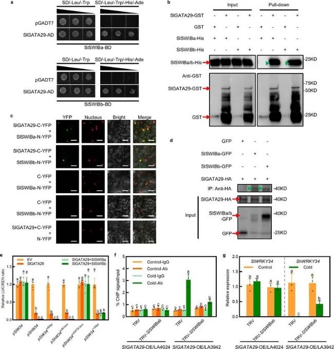 SWIBs和GATA29直接結(jié)合到WRKY34啟動子的60bp InDel片段:通過酵母單雜交(Y1H)篩選,發(fā)現(xiàn)GATA家族轉(zhuǎn)錄因子SlGATA29和兩個SWIB/MDM2結(jié)構(gòu)域蛋白SlSWIBa和SlSWIBb能夠結(jié)合60bp InDel區(qū)域;SlGATA29和SlSWIBa/b通過與該區(qū)域結(jié)合抑制WRKY34的表達,且SlSWIBs和GATA29能夠協(xié)同抑制WRKY34的表達。