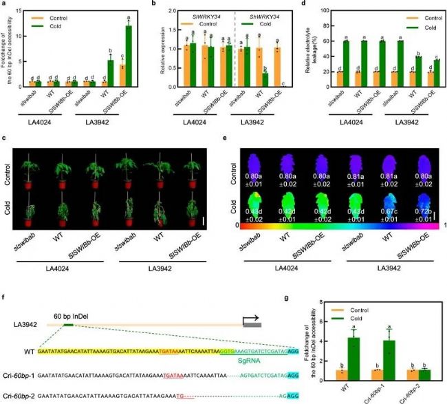 SWIB和GATA29通過60bp InDel影響染色質(zhì)可及性和耐寒性:在LA4024或LA3942背景下構(gòu)建SlSWIBb過表達株系和slswibab雙突變體,發(fā)現(xiàn)SWIBs能夠增強WRKY34啟動子的染色質(zhì)開放,從而提高番茄的耐寒性;構(gòu)建SlGATA29過表達株系和slgata29突變體,發(fā)現(xiàn)GATA29也能夠抑制WRKY34的表達,從而影響番茄的耐寒性;通過CRISPR/Cas9刪除LA3942中ShWRKY34啟動子的60bp,發(fā)現(xiàn)該區(qū)域的染色質(zhì)可及性減弱,WRKY34的表達抑制被消除,且植物對冷脅迫更敏感。