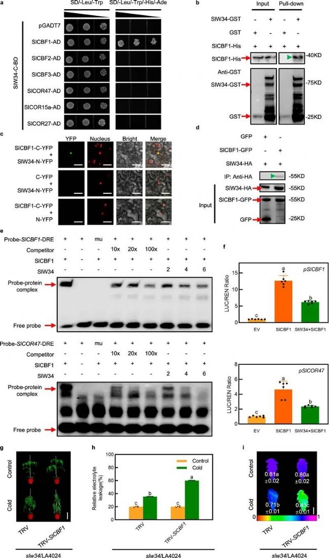 圖7 SlWRKY34 干擾了SlCBF1 的轉(zhuǎn)錄活性,從而降低了番茄幼苗的耐寒性。