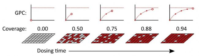圖1:表面覆蓋率θ:在一個 ALD 半周期內(nèi),表面覆蓋率和 GPC 與給藥時間的關(guān)系。
