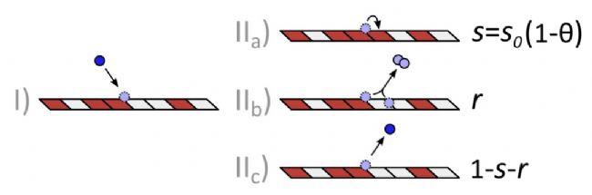 圖 2:(等離子) ALD 過程中氣相反應(yīng)物(藍(lán)色圓圈)與表面之間的模擬相互作用圖,其中方塊代表空的(白色)和已占用的(紅色)吸附位點(diǎn)。當(dāng)反應(yīng)物分子或原子撞擊表面 (I) 時,它可以吸附在空的吸附位點(diǎn) (IIa ),與表面上的另一個原子重新結(jié)合 (IIb ) 或反射 (IIc )。只有吸附 (IIa ) 才能增加表面覆蓋率。