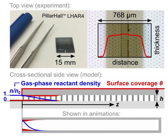 圖 4:在實(shí)驗(yàn)中使用的由 VTT 提供的 PillarHall ™水平溝槽結(jié)構(gòu)圖片(頂部),其中硅膜被移除,沉積的薄膜可見。結(jié)構(gòu)的示意橫截面(中間)顯示了氣相反應(yīng)物密度(藍(lán)線)和表面覆蓋率(紅色輪廓)。