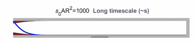 第一個動畫,其中 S0AR2=0.01,對應(yīng)于反應(yīng)限制生長。為了完整地表示生長過程,此動畫分為“短時間尺度”部分和“長時間尺度”部分。在現(xiàn)實(shí)生活中,這些階段分別大約需要微秒和秒,具體取決于實(shí)驗(yàn)條件。在短時間尺度部分,我們可以看到藍(lán)線移動到溝槽中,直到它在各處具有相同的值。這對應(yīng)于氣相反應(yīng)物分子擴(kuò)散到溝槽中,直到它們均勻分布。在長時間尺度部分,我們可以看到這導(dǎo)致表面覆蓋率均勻增加,如紅色輪廓所示。