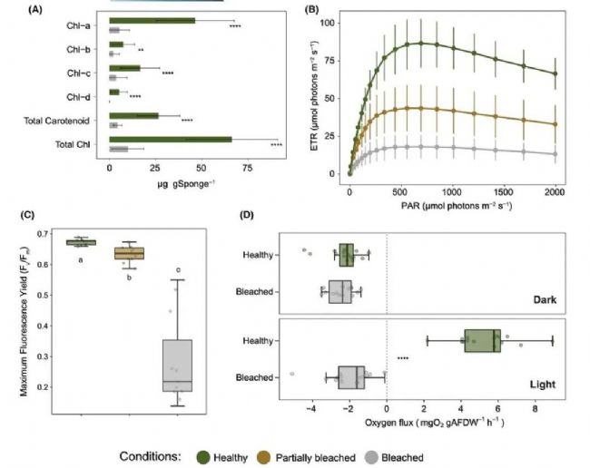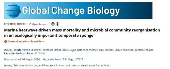 2. Marine heatwave-driven mass mortality and microbial community reorganisation in an ecologically important temperate sponge (Global Change Biology, IF=10.8)隨著全球氣候的不斷變化,海洋熱浪(MHWs)的頻率、持續(xù)時間和強度都在增加,破壞了全球海洋生態(tài)系統(tǒng)。雖然報告的大多數(shù)影響都發(fā)生在熱帶地區(qū),但新西蘭卻在2022年經(jīng)歷了強度最大、持續(xù)時間最長的海洋熱浪,對海洋海綿造成了嚴重影響。海綿對巖石底棲海洋生物群落至關(guān)重要,其數(shù)量影響著生態(tài)系統(tǒng)的功能。2024年8月6日,Global Change Biology在線發(fā)表新西蘭維多利亞大學生物科學學院James J. Bell等人標題為Marine heatwave-driven mass mortality and microbial community reorganisation in an ecologically important temperate sponge的研究論文。文章探討了2022年那次MHW對新西蘭峽灣地區(qū)光合作用海綿(Cymbastella lamellata)的影響。