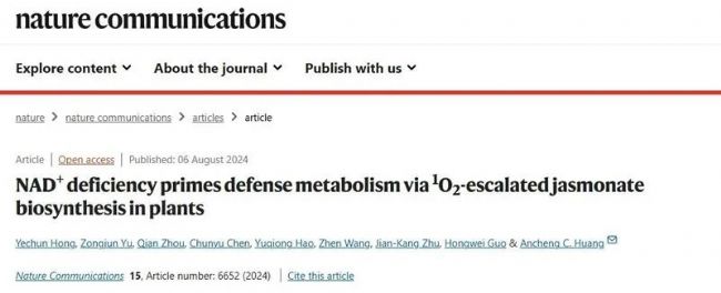 煙酰胺腺嘌呤二核苷酸(NAD+)是一種氧化還原輔助因子,是細胞代謝的中心信號。破壞植物體內(nèi)NAD的平衡會改變植物的生長和抗逆性,但其潛在機制仍不清楚。2024年8月6日,南方科技大學黃安誠團隊在Nature Communications 在線發(fā)表題為“NAD+ deficiency primes defense metabolism via 1O2-escalated jasmonate biosynthesis in plants”的研究論文,該研究概述了植物中NAD+缺陷介導(dǎo)的JA誘導(dǎo)和防御啟動序列,表明這種防御機制在植物的脅迫響應(yīng)中起作用。