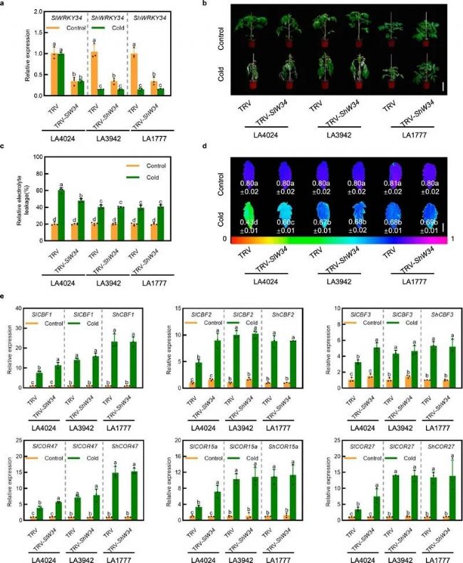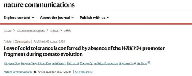 研究人員在煙草系統(tǒng)和野生型擬南芥蟲咬應(yīng)答條件下復(fù)現(xiàn)了NAD+含量降低激活單線態(tài)氧和茉莉酸合成的信號轉(zhuǎn)導(dǎo)通路,表明此信號轉(zhuǎn)導(dǎo)通路能夠在植物調(diào)節(jié)自身代謝以平衡生長與抗性中起重要作用。因此,本項研究首次揭示了“NAD+穩(wěn)態(tài)->單線態(tài)氧激活->茉莉酸合成轉(zhuǎn)導(dǎo)->次級代謝產(chǎn)物(芥子油苷)合成”的完整應(yīng)答通路介導(dǎo)植物抗(蟲)性防御反應(yīng)的分子機制,從而提出了NAD+穩(wěn)態(tài)是平衡植物生長與抗(蟲)性的關(guān)鍵“代謝監(jiān)測點”(metabolic checkpoint)的分子模型(圖1),為深入了解植物—環(huán)境互作的信號轉(zhuǎn)導(dǎo)機制與代謝基礎(chǔ)提供了新見解,也為植物抗性改造和育種增添了理論基礎(chǔ)。番茄是全球重要的蔬菜作物,起源于南美洲安第斯山脈地區(qū)。在番茄的進化和人類選擇過程中,由于生長環(huán)境的改變(從高海拔到低海拔),使得低溫不再是番茄進化選擇的主要逆境壓力,這造成了現(xiàn)代栽培番茄耐寒能力下降。然而,隨著我國設(shè)施農(nóng)業(yè)的快速發(fā)展,冬春低溫造成的設(shè)施蔬菜冷害業(yè)已成為限制產(chǎn)業(yè)高質(zhì)量發(fā)展的瓶頸問題。因此,解析設(shè)施主栽喜溫蔬菜番茄耐寒能力下降的機制,創(chuàng)制耐寒種質(zhì)和調(diào)控技術(shù),對于產(chǎn)業(yè)發(fā)展具有重要意義。2024年8月6日,浙江大學喻景權(quán)院士周杰教授團隊在Nature Communications在線發(fā)表了題為“Loss of cold tolerance is conferred by absence of the WRKY34 promoter fragment during tomato evolution”的研究論文。該研究以冷敏感的栽培番茄 (Solanum lycopersicum)和耐寒的野生多毛番茄(Solanum habrochaites)為對象,通過多組學聯(lián)合分析以及生理生化、遺傳學和生物信息學等手段,揭示了在野生番茄和栽培番茄中WRKY34低溫表達模式差異的原因,及其調(diào)控番茄耐寒能力的具體機制。