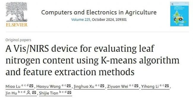 準確評估葉氮含量(LNC)對實際生產(chǎn)和肥料管理至關(guān)重要。2024年8月7日,西北農(nóng)林科技大學信息工程學院胡瑾教授課題組在Computers and Electronics in Agriculture發(fā)表題為A Vis/NIRS device for evaluating leaf nitrogen content using K-means algorithm and feature extraction methods的研究論文。在這項研究中,盧苗等人設(shè)計了一種便攜式設(shè)備,用于快速、無損地精確評估葉氮含量。