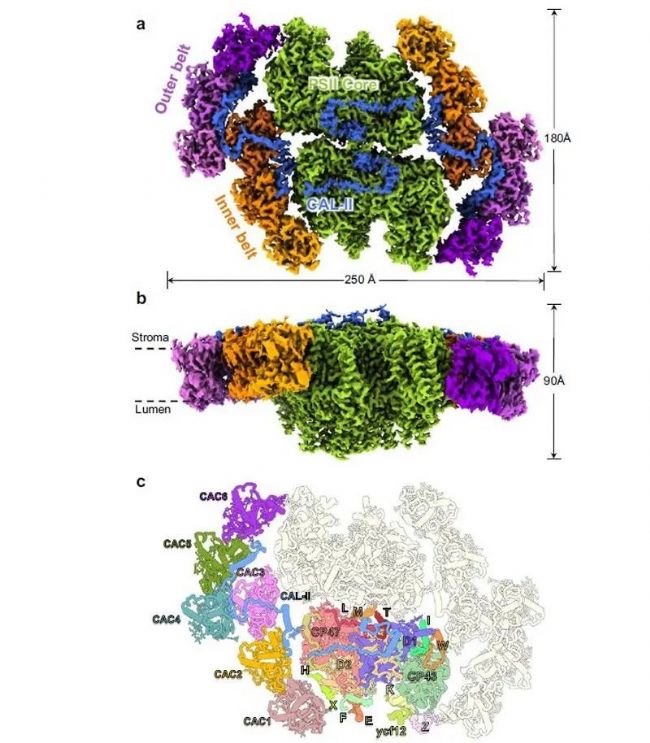 放氧光合作用是自然界中重要的生命過程,可以將光能轉(zhuǎn)化為化學能,合成有機物的同時釋放氧氣,為地球上絕大多數(shù)生命提供物質(zhì)和能量。位于類囊體膜上的光系統(tǒng)I(photosystem I, PSI)和光系統(tǒng)II (photosystem II, PSII)對于光合作用光反應(yīng)至關(guān)重要,兩個光系統(tǒng)均由核心和外周捕光天線構(gòu)成,其中光系統(tǒng)核心是高度保守的,但結(jié)合在核心外周的捕光天線在不同物種間存在著巨大差異,這些差異反映了不同光合生物對特定生存環(huán)境的適應(yīng),也體現(xiàn)了自然界中多樣的光合調(diào)節(jié)機制。隱藻是由紅藻經(jīng)次級內(nèi)共生過程演化出的一類單細胞真核微藻,具有極其獨特的捕光天線,包括位于類囊體膜內(nèi)的葉綠素 a/c 結(jié)合蛋白(chlorophyll a/c proteins,CAC)和結(jié)合在類囊體膜外腔側(cè)的藻膽蛋白(phycobiliprotein,PBP)。由于缺少隱藻光系統(tǒng)的結(jié)構(gòu)信息,其核心與捕光天線的組裝方式及其捕光調(diào)節(jié)機制尚不清楚,解析隱藻光系統(tǒng)-捕光天線復(fù)合物的高分辨率結(jié)構(gòu)不僅為揭示這類光合生物的光合調(diào)節(jié)機制提供結(jié)構(gòu)基礎(chǔ),而且能夠為提高植物的光能利用效率、增加作物產(chǎn)量等提供新思路。