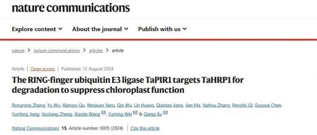 植物葉綠體在光合作用和免疫中起關(guān)鍵作用,但小麥中控制葉綠體相關(guān)核基因表達的精確及時的轉(zhuǎn)錄調(diào)節(jié)機制在很大程度上仍未知。泛素化是一種重要的翻譯后調(diào)節(jié)過程,E3泛素連接酶在植物的激素反應(yīng)、發(fā)育和免疫等多種細胞過程中起作用,但泛素連接酶E3在小麥免疫中的作用及其底物識別模式尚不清楚。2024年8月12日,Nature Communications在線發(fā)表了四川農(nóng)業(yè)大學魏育明/許強教授團隊聯(lián)合西北農(nóng)林科技大學王曉杰教授團隊題為The RING-finger ubiquitin E3 ligase TaPIR1 targets TaHRP1 for degradation to suppress chloroplast function的研究論文。本研究揭示了小麥中RING型泛素E3連接酶TaPIR1通過泛素化并降解轉(zhuǎn)錄因子TaHRP1來抑制葉綠體功能,從而增加植物對條銹病(Pst)的敏感性。