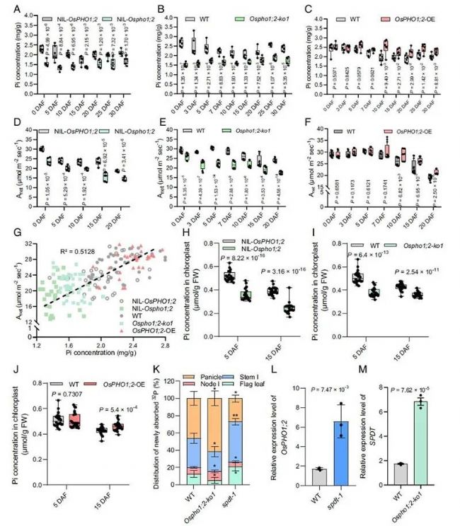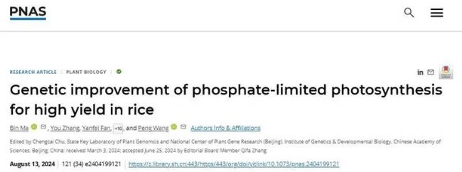2024年8月13日, PNAS在線發(fā)表了中國科學院分子植物科學卓越創(chuàng)新中心王鵬課題組與何祖華課題組合作完成的題為Genetic improvement of phosphate-limited photosynthesis for high yield in rice的研究論文,發(fā)現(xiàn)水稻OsPHO1;2磷轉(zhuǎn)運蛋白能夠向葉片分配無機磷,其表達量與葉片Pi含量、凈光合速率以及產(chǎn)量的增高呈正相關(guān)。