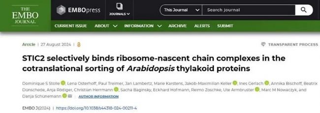 10. STIC2 selectively binds ribosome-nascent chain complexes in the cotranslational sorting of Arabidopsis thylakoid proteins (The EMBO Journal, IF=9.4)葉綠體編碼的多種跨類囊體膜蛋白質(zhì)對光合作用復(fù)合物至關(guān)重要,但人們對其生物發(fā)生的協(xié)調(diào)過程仍然知之甚少。2024年8月27日,The EMBO Journal在線發(fā)表德國魯爾大學Danja Schünemann課題組標題為STIC2 selectively binds ribosome-nascent chain complexes in the cotranslational sorting of Arabidopsis thylakoid proteins的研究論文。文章將STIC2 確定為一種新的核糖體相關(guān)因子,并提出STIC2與cpSRP54合作,將D1和潛在的其他葉綠體編碼的光合亞基共翻譯遞送至類囊體膜。
