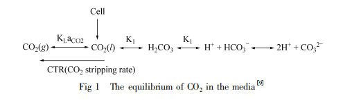 CO2是有氧呼吸的產(chǎn)物之一,同時作為底物參與回補(bǔ)反應(yīng)。哺乳動物細(xì)胞培養(yǎng)中,CO2的來源包括細(xì)胞呼吸產(chǎn)生的CO2、培養(yǎng)基中NaHCO3的分解和控制pH 值加入的CO2和 NaHCO3/Na2CO3等。動物細(xì)胞培養(yǎng)大多使用碳酸-碳酸氫鹽( H2CO3-HCO3-) 緩沖系統(tǒng),因此CO2 存在如圖1的平衡反應(yīng),K1和 K2 為反應(yīng)平衡常數(shù)( 37 ℃ ) ,kLaCO2為CO2體積傳質(zhì)系數(shù),CTR為CO2傳質(zhì)速率( Carbon dioxide transfer rate) ,還可以用CO2逸出速率表示( CO2 stripping rate) ,CER為CO2轉(zhuǎn)化速率( Carbon dioxide evolution rate) 。