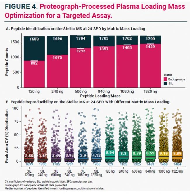 ■ 該研究還調(diào)查了蛋白質(zhì)組生物標(biāo)志物驗(yàn)證的最佳上樣量。由于其高定量重現(xiàn)性和靈敏度,600 ng 被確定為最佳上樣量(圖4)。