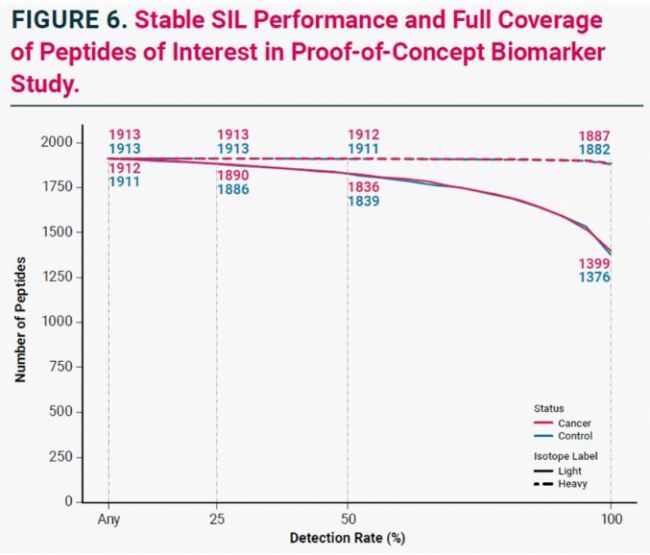 ■ 靶向檢測(cè)方法被應(yīng)用于由 23 名癌癥患者和 21 名非癌癥對(duì)照組成的生物隊(duì)列。Stellar 質(zhì)譜儀成功檢測(cè)出 1,960 種 SIL 肽中的 1,913 種,證明了其能夠全面覆蓋目標(biāo)肽段及臨床應(yīng)用潛力。Stellar質(zhì)譜平臺(tái)在幾天內(nèi)表現(xiàn)出高度的重現(xiàn)性和穩(wěn)定性,CV 小于 12%(圖6)。