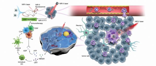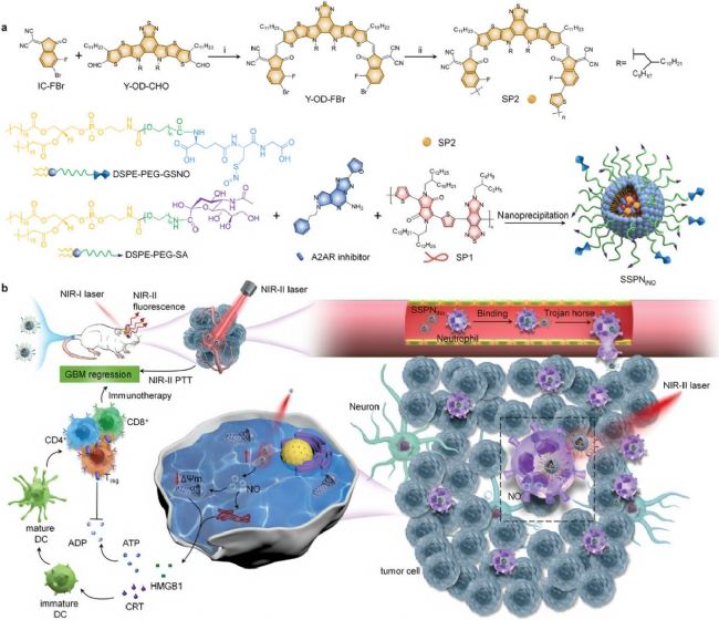 在本研究中,構(gòu)建了含有兩種SP,一種熱反應(yīng)性NO供體和A2AR抑制劑的中性粒細(xì)胞靶向納米治療平臺(SSPNiNO),用于NIR-II熒光成像引導(dǎo)的原位GBM聯(lián)合治療。SSPNiNO的表面被一種中性粒細(xì)胞靶向配體修飾,這使得它們能夠粘附到中性粒細(xì)胞上,穿過BBB,并有效遞送到原位GBM位點。兩種SP的摻雜實現(xiàn)了NIR-II熒光成像和PTT。在NIR-II激光照射下,SSPNiNO可以將光能轉(zhuǎn)化為熱量,導(dǎo)致局部溫度升高,熱響應(yīng)性NO供體釋放NO。因此,在將SSPNiNO尾靜脈注射到原位攜帶GBM的小鼠體內(nèi)后,NIR-II激光可以遠(yuǎn)程觸發(fā)原位NO釋放和光熱效應(yīng),從而誘導(dǎo)ICD效應(yīng)和免疫“冷”腫瘤向“熱”腫瘤的轉(zhuǎn)變。此外,SSPNiNO遞送A2AR抑制劑以阻斷腺苷途徑的抑制,進(jìn)一步增強免疫效果以根除原位GBM。目前,這是首次使用聚合物納米診療平臺,在NIR-II熒光成像引導(dǎo)的原位GBM PTT-NO-免疫治療中的開創(chuàng)性研究。