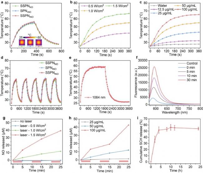 為了研究制備的納米治療試劑的光熱性能,使用紅外熱像儀監(jiān)測了在1064nm激光照射下的納米顆粒溶液的溫度波動。SSPNNO、SPNiNO和SSPNiNO溶液的溫度在激光照射下迅速升高,并在照射6分鐘后達(dá)到峰值(55°C)(圖2a)。這些納米粒子的加熱和冷卻曲線相似,表明它們具有一致的光熱性能。納米治療的光熱效應(yīng)表現(xiàn)出對納米粒子濃度和激光功率強度的依賴性。在激光照射6分鐘后,SSPNiNO溶液的溫度分別升高到41.9、55.0和66.9°C,激光功率強度分別為0.5、1.0和1.5 W cm-2(圖2b)。當(dāng)功率強度設(shè)置為1.0 W cm-2時,SSPNiNO溶液的溫度分別在12.5、25、50和100µg mL-1的濃度下升高到32.2、43.0、55.0和65.5°C(圖2c)。在NIR-II激光器開啟/關(guān)閉的5個周期內(nèi),SSPNNO、SPNiNO和SSPNiNO的加熱和自然冷卻曲線幾乎沒有變化(圖2d),表明它們具有良好的光熱穩(wěn)定性。這些納米粒子的光熱轉(zhuǎn)換效率約為57.4%(圖2e)。