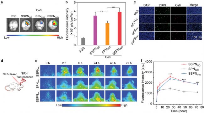 使用原位GBM模型評估了納米治療診斷藥物的體內(nèi)腦靶向能力。從原位GBM的小鼠中提取大腦。與對照組和SPNiNO處理的小鼠相比,SSPNNO和SSPNiNO處理的小鼠的腦熒光強度顯著升高(圖3a,b)。此外,在腫瘤部位觀察到最突出的熒光信號。提取的大腦也被切成切片進(jìn)行免疫熒光染色。盡管在SPNiNO治療組的大腦中也可以檢測到熒光信號,但在SSPNNO和SSPNiNO治療組的腦中檢測到最強烈的信號(圖3c)。與SPNiNO處理組相比,SSPNNO和SSPNiNO處理組的熒光強度增加了約三倍。此外,Ce6標(biāo)記的SSPNNO和SSPNiNO的熒光信號與中性粒細(xì)胞的染色信號顯示出高度的共定位,這意味著中性粒細(xì)胞劫持在促進(jìn)靶向納米治療藥物的腫瘤積聚中起著至關(guān)重要的作用。