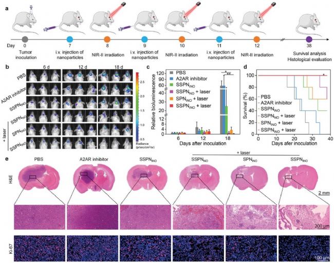 原位C6-GBM攜帶Balb/c小鼠模型已用于體內(nèi)抗腫瘤作用評估。使用原位螢光素酶(Luc)-C6-GBM小鼠模型評估了納米治療劑的體內(nèi)抗腫瘤療效(圖4a)。用NIR-II激光照射原位GBM位點以介導(dǎo)體內(nèi)抗腫瘤治療,并記錄腫瘤的溫度。在NIR-II照射10分鐘后,注射SSPNNO和SSPNiNO的小鼠的腫瘤溫度升高了≈27.0°C,比NIR-II激光照射下注射SPNiNO的小鼠高10°C。如圖4b所示,與對照組相比,注射SSPNiNO和NIR-II激光照射(10分鐘)顯示出顯著的腫瘤生長抑制作用,這可以從腫瘤部位Luc信號強度的顯著降低中得到證明。相比之下,SPNiNO+激光和SSPNNO+激光僅顯示出部分抑制作用。SPNiNO+激光、SSPNNO+激光和SSPNiNO+激光組腫瘤部位的生物發(fā)光強度總體上低于PBS、游離A2AR抑制劑和SSPNiNO組(圖4c),表明基于納米治療的組合療法具有抗腫瘤療效。SSPNiNO+激光組在治療18天后,腫瘤部位的生物發(fā)光強度最低。還通過測量小鼠的存活時間來評估抗GBM的療效。在對照組中,C6-GBM模型的中位生存期僅為23天,而游離A2AR抑制劑治療將中位生存時間略微增加到24天(圖6d)。相比之下,SPNiNO+激光、SSPNNO+激光和SSPNiNO+激光組的存活時間延長。在用NIR-II激光照射SPNiNO和SSPNNO后,60%的攜帶GBM的小鼠在接種腫瘤38天后仍然存活。SSPNiNO+激光組在整個觀察期內(nèi),所有攜帶GBM的小鼠均存活。攜帶GBM的小鼠的體重在腫瘤生長過程中逐漸下降。SSPNiNO+激光組的體重減輕最小,表明其抗GBM療效最佳。
