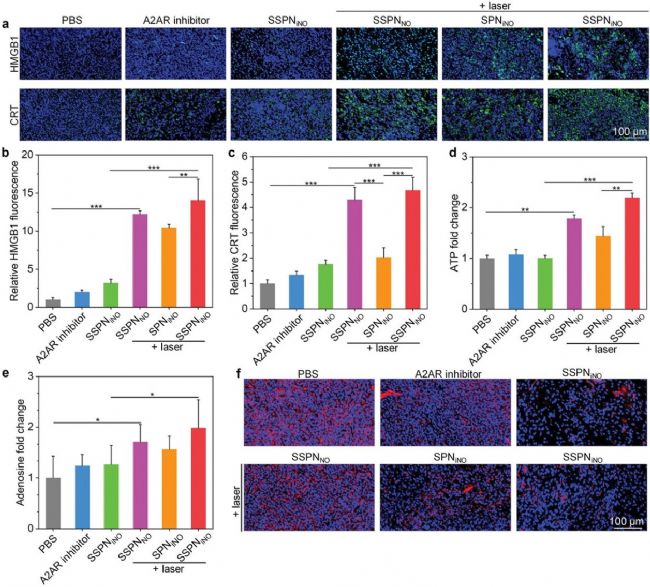 研究治療后的ICD效果。在SPNiO+激光、SSPNO+激光和SSPNiNO+激光組中,綠色熒光信號相比對照組顯著增加(圖5a)。在SSPNO+激光和SSPNiNO+激光組中,與PBS組相比,HMGB1熒光強度分別增加了1.8倍和2.2倍(圖5b)。SSPNO+激光和SSPNiNO+激光組的CRT染色信號強度分別增加了6.1倍和7.4倍(圖5c)。因此,與PBS組相比,SSPNO+激光組腫瘤中的ATP水平分別增加了1.8倍和2.2倍(圖5d)。然而,SSPNiNO和游離A2AR抑制劑組的ATP水平?jīng)]有顯著升高。