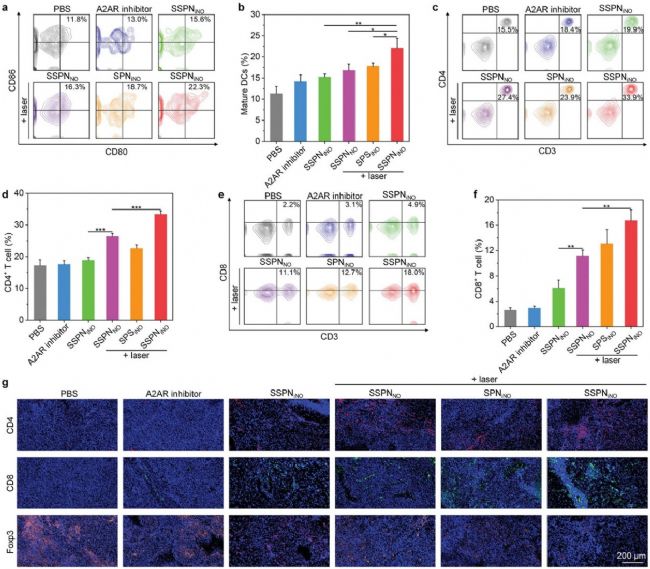 為了驗證體內(nèi)增強的免疫反應(yīng),研究了脾臟、引流淋巴結(jié)和腫瘤中的免疫細(xì)胞。如圖6a所示,在各種治療方案后,引流淋巴結(jié)中樹突狀細(xì)胞(DCs)的百分比有所增加。在SPNiNO+激光、SSPNNO+激光和SSPNiNO+激光組中,DCs百分比分別增加到17.8%、16.8%和22.1%(圖6b)。在SSPNiNO+激光組中觀察到最高水平的CD4 T細(xì)胞(33.4%)(圖6d)。同樣,在應(yīng)用納米治療和NIR-II激光照射后,CD8 T細(xì)胞水平顯著上升(圖6e,f)。值得注意的是,SSPNiNO+激光組的DC、CD4 T細(xì)胞和CD8 T細(xì)胞總體上高于SSPNNO+激光組,這表明A2AR抑制劑對全身免疫功能具有調(diào)節(jié)作用。