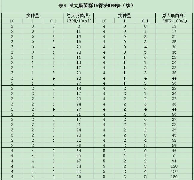 根據(jù)證實為總大腸菌群陽性的管數(shù),查MPN表(見表3和表4),報告每100ml 水樣中的總大腸菌群 MPN值。稀釋樣品查表后所得結(jié)果應(yīng)乘稀釋倍數(shù)。如所有乳糖發(fā)酵管均為陰性時,可報告總大腸菌群未檢出。