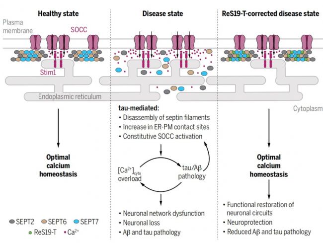 異常鈣信號(hào)是阿爾茨海默。ˋD)的核心病理組成部分。本研究篩選出了ReS19-T的化合物,它能夠在基于細(xì)胞的tau病理模型中恢復(fù)鈣穩(wěn)態(tài)。異常的tau積累導(dǎo)致通過重塑細(xì)胞皮質(zhì)的septin絲體不受控制地激活儲(chǔ)存操作鈣通道(SOCCs)。ReS19-T與septin結(jié)合,可以在疾病狀態(tài)下恢復(fù)絲體的組裝,并抑制SOCCs的鈣離子進(jìn)入。在由淀粉樣β和tau驅(qū)動(dòng)的小鼠疾病模型中,ReS19-T藥物恢復(fù)突觸可塑性,使腦網(wǎng)絡(luò)活動(dòng)正常化,并減輕淀粉樣蛋白β和tau病理的發(fā)展。研究結(jié)果確定了septin細(xì)胞骨架是開發(fā)疾病修飾性AD治療的潛在治療靶點(diǎn)。