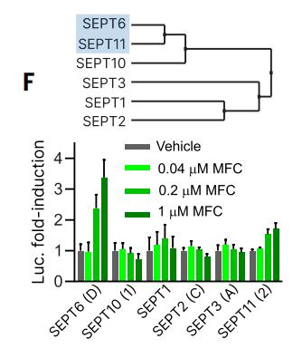 圖2,胞內(nèi)相互作用,不同septin亞型的MFC (REM929 - linked to甲氨蝶呤)(N = 3,誤差條表示SD)。插圖顯示了在三雜交實(shí)驗(yàn)中探測(cè)到的septin同種異構(gòu)體的系統(tǒng)發(fā)育分析