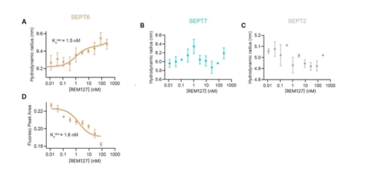 對(duì)于SEPT7和SEPT2未檢測(cè)到化合物誘導(dǎo)的水動(dòng)力半徑變化。這些體外結(jié)合研究表明REM127直接與SEPT6高親和力結(jié)合,并可能影響靶點(diǎn)構(gòu)象。研究還提供了REM127與SEPT7和SEPT2之間較弱結(jié)合的證據(jù)。