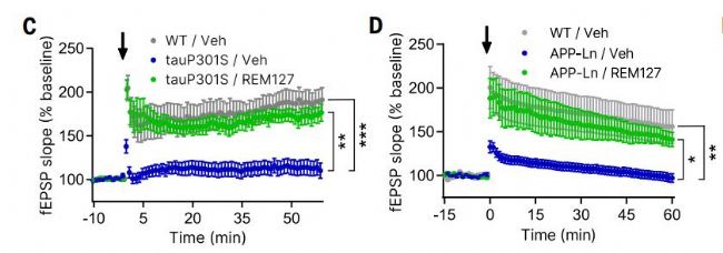圖5(C)WT和tauP301S小鼠(3.5月齡,每組N = 8)給予載藥或REM127 (20 mg/kg/天)2個(gè)月CA1 LTP。箭頭表示LTP誘導(dǎo)刺激。(D) WT/Veh (N = 5)、APP-Ln/Veh (N = 8)和APP-Ln/REM127 (N = 6)小鼠(7月齡)灌胃或REM127 (20 mg/kg/天)7 D后CA1 LTP的變化