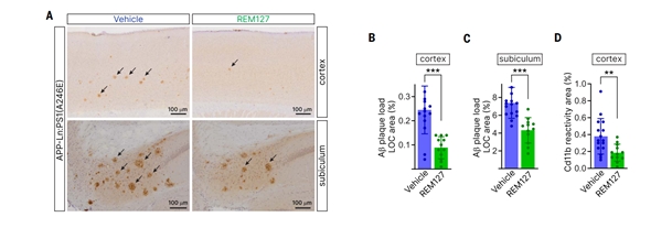 圖6(A至D) APP-Ln:PS1(A246E)小鼠3個(gè)月后給藥(N = 16)或口服REM127 (N = 12),劑量為20mg /kg/天。(A至C)抗淀粉樣蛋白原纖維染色的Ab斑塊皮質(zhì)[(A)和(B)]和托骨下[(A)和(C)]的LOC抗體。(D)皮層CD11b免疫反應(yīng)性