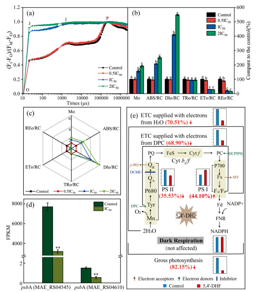 5,4′-DHF對(duì)銅綠假單胞菌光合系統(tǒng)的影響。(a) 用FO和FM歸一化的Chl a擴(kuò)散動(dòng)力學(xué)為Vt=(Ft-FO)/(FM-FO)不同濃度5,4′-DHF處理銅綠假單胞菌的對(duì)數(shù)時(shí)間尺度。(b) 不同濃度下銅綠假單胞菌的JIP檢測(cè)參數(shù)以對(duì)照的百分比表示的5,4′-DHF。(c) JIP參數(shù)的雷達(dá)圖。(d) 相關(guān)基因的標(biāo)準(zhǔn)化轉(zhuǎn)錄豐度(FPKM)用5,4′-DHF的IC50濃度處理銅綠假單胞菌的光合系統(tǒng)。psbA(MAE_RS04545)和psbA(MABE_RS04610)編碼光系統(tǒng)II D1蛋白質(zhì)。(e) 藍(lán)藻細(xì)胞光合電子傳遞的示意圖,顯示了5,4′-DHF對(duì)光合作用電子傳遞的影響通過(guò)測(cè)量O2的釋放/消耗速率。條形圖結(jié)果顯示了O2釋放/消耗率占對(duì)照的百分比。紅色箭頭表示5,4′-DHF對(duì)相應(yīng)部位的抑制率/促進(jìn)率。它還顯示了人工電子供體、受體和抑制劑的作用位點(diǎn)在本研究中使用。不同的字母表示從單因素方差分析中獲得的p<0.05的統(tǒng)計(jì)學(xué)顯著差異。(**)代表統(tǒng)計(jì)數(shù)據(jù)學(xué)生t檢驗(yàn)得出p<0.01的顯著差異。