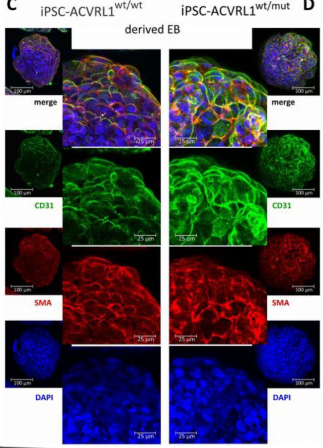 ”胚胎體(EBs)中內(nèi)皮分化的誘導(dǎo)。圖示為共聚焦顯微鏡圖像,展示了(A)ACVRL1wt/wt和(B)ACVRL1wt/mut胚胎體在內(nèi)皮誘導(dǎo)后CD31+細(xì)胞的出現(xiàn)。使用Phalloidin標(biāo)記F(絲狀)-肌動(dòng)蛋白細(xì)胞骨架,DAPI用于染色細(xì)胞核。(C,D)使用抗平滑肌肌動(dòng)蛋白的抗體對(duì)胚胎體進(jìn)行染色,以檢測(cè)可能的周細(xì)胞結(jié)構(gòu)。”