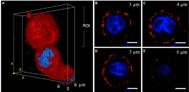 “激光掃描共聚焦顯微鏡下,懸浮hPBMCs(n = 50,1n = 單個(gè)分析細(xì)胞)在與rAβ42(15 nM)孵育24小時(shí)后的代表性3D影像(A)。數(shù)據(jù)集由感興趣區(qū)域(ROI,x–z平面)中4個(gè)光學(xué)切片組裝而成,步長(zhǎng)為1 μm(B–E)。藍(lán)色 – 核DNA由DAPI染料染色;紅色 – rAβ42由CRANAD-2染色。標(biāo)尺 = 5 μm。”