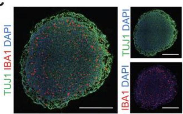 “C 代表性免疫熒光圖像顯示,iPSdMiG(IBA1,紅色)遷移到并均勻分布在3D皮層類(lèi)胚體中(TUBB3,綠色);細(xì)胞核用DAPI染色。標(biāo)尺=500 μm。