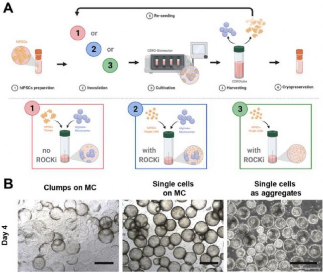 A2:iPSC單細(xì)胞被接種在Matrigel涂層的海藻酸鹽微載體上,培養(yǎng)基中添加了10 μM Y-27632。