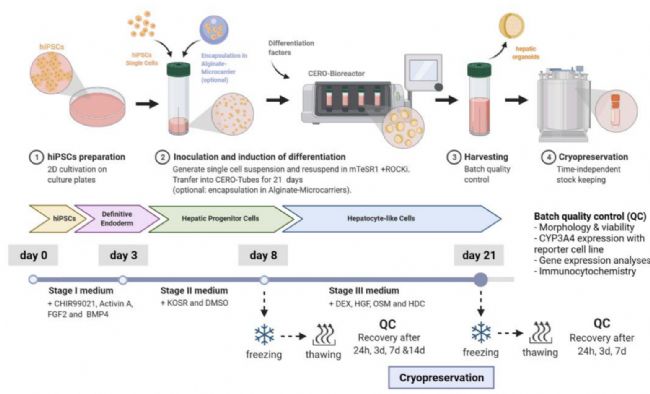 “人類(lèi)iPSC衍生肝細(xì)胞在懸浮培養(yǎng)(3D)中的分化流程概述。第一步是建立穩(wěn)健的2D分化方案,將肝細(xì)胞(HLCs)從初始階段分化至成熟階段。第二步,將該方案轉(zhuǎn)化為CERO 3D(OLS)懸浮生物反應(yīng)器中的3D培養(yǎng)模式。最后,在兩個(gè)分化時(shí)間點(diǎn)(第8天和第21天)對(duì)肝臟類(lèi)器官進(jìn)行冷凍保存,以評(píng)估存儲(chǔ)效率。分化過(guò)程中和解凍后的恢復(fù)過(guò)程中進(jìn)行的不同質(zhì)量控制(QC)展示了肝臟類(lèi)器官的質(zhì)量。”