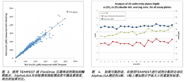 通過AlphaLISA自動(dòng)檢測系統(tǒng)處理736個(gè)樣品,連續(xù)兩天進(jìn)行兩次單獨(dú)的測定。第一天的使用兩臺(tái)FlexDrop裝置處理樣品,將抗體和珠子分配到酶聯(lián)板上。第2天使用TEMPEST來處理樣品和分配試劑,并對所得的濃度值進(jìn)行比較(圖3)。得到的R2值為0.9741,平均回收率為101%。