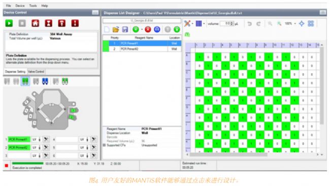 MANTIS®軟件提供了一個易于使用、用戶友好的方式來設(shè)計和運行您的檢測。只需將試劑添加到分配列表中,定義體積,并在虛擬板上點選以定義您希望試劑分配的位置。MANTIS軟件能夠設(shè)計梯度和回填,此外還能夠?qū)?txt和.csv的分配列表。