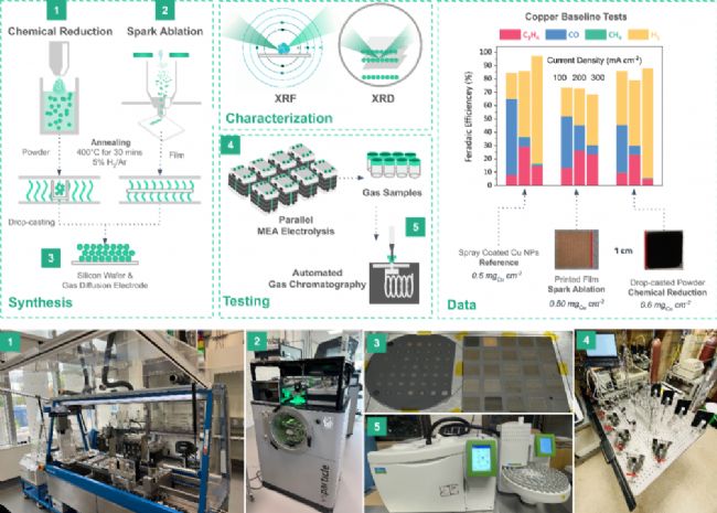 該圖說明了實驗流程,詳細說明了從合成到表征和測試的過程。(右)兩種合成技術和使用噴涂 Cu 納米粒子的參考樣品。所有技術都可以看到電流密度的類似趨勢
